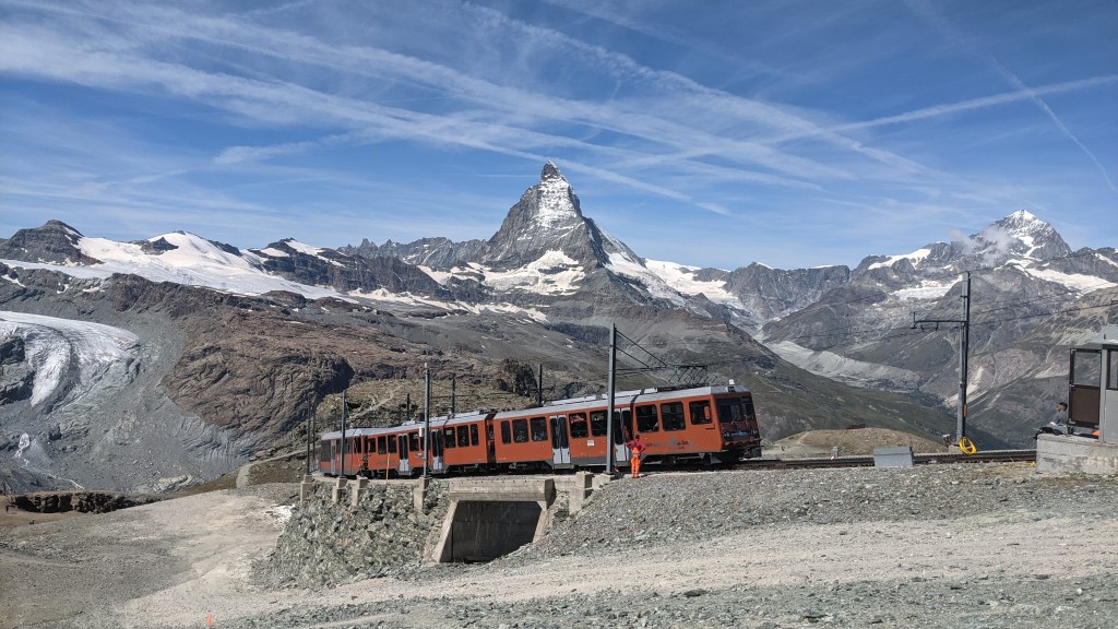 Lo que teníamos planeado para hoy nos va a llevar a un tren, una montaña y un paseo. Empezamos el día en la estación de Zermatt GGB. De esta estación sale el Gornergrat Railway, que nos llevará desde Zermatt a Gornergrat, donde empezamos nuestro día. El primer tren de la mañana sale sobre las 7 de la mañana, pero ya teníamos muy claro que no íbamos a llegar (nos gusta desayunar tranquilos) .. el de las 8 como que tampoco asi que el de las 9 será.